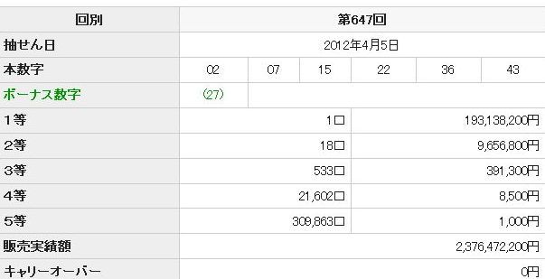 ハズレていると思っていた中から、647回のが、1つ5等に当っていた。